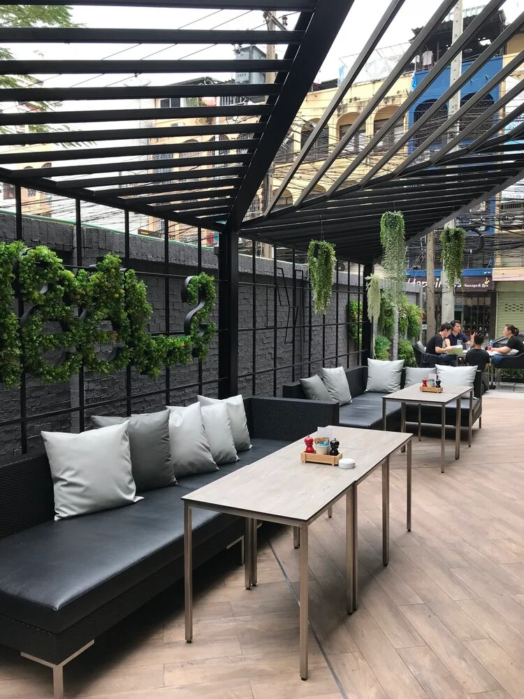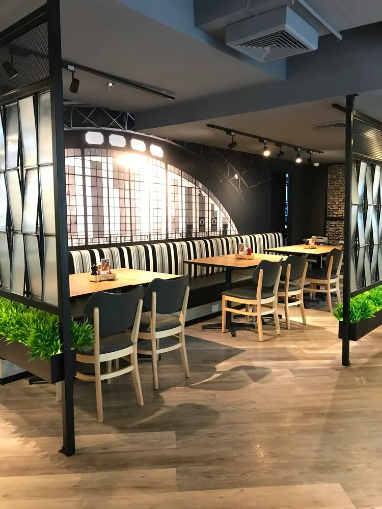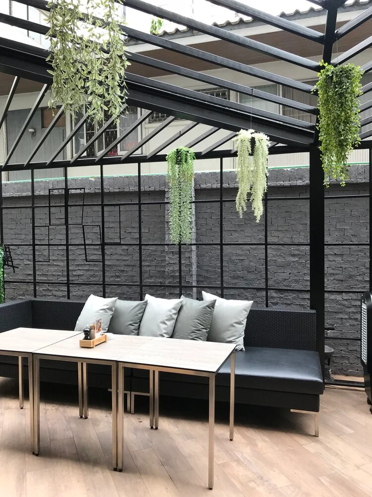“A place to hang out with friends with an outdoor garden” was the concept requirement of the client. That led to texture exploration by the designer for the interior space using glass partitions with random openings to provide for a semi private vibe in certain areas of the café.